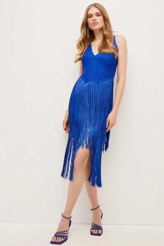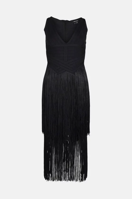 Stride into the party with all eyes on you. This statement fringed midi dress blends unexpected tasselled tiers with our signature bandage knit fabric to sculpt curves to perfection. Finished with a V-neck bodice, this sustainably made style is perfect for summer parties.