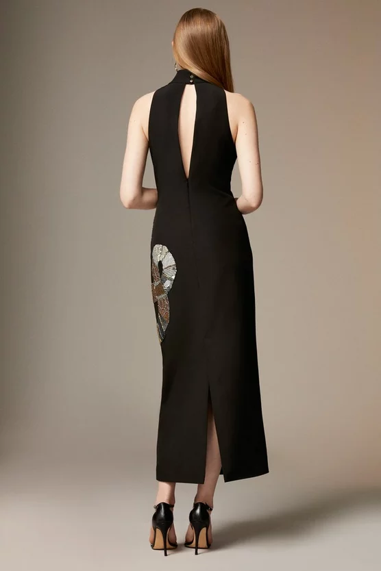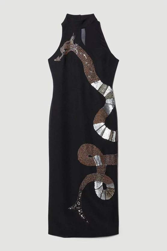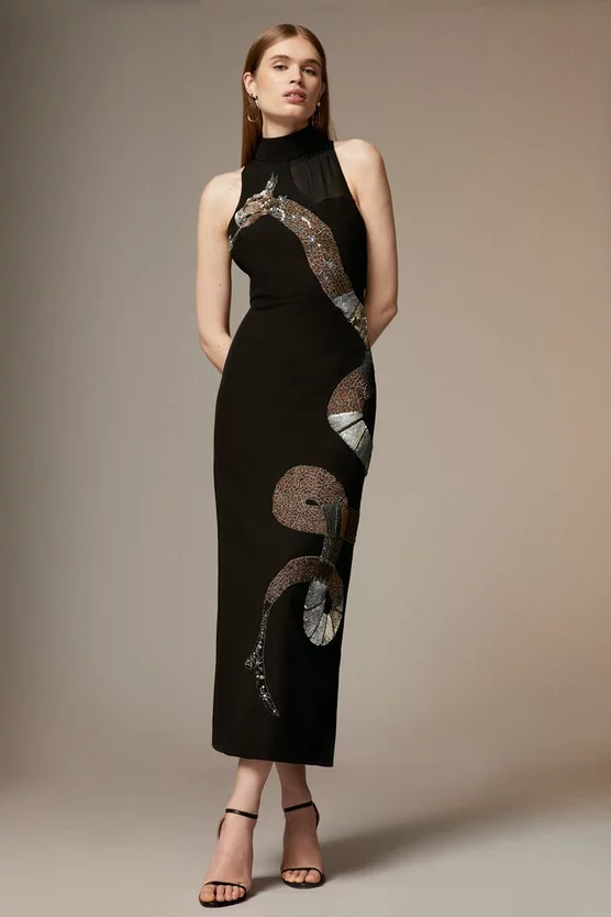 Divinely decorated with a dragon motif crafted from hand-embroidered sequin and bead embellishments, this midi dress strikes the perfect balance between surreal and sultry. This eclectic piece takes inspiration from mythology and exudes artisanal allure to the highest degree. Style with sleek black heels and minimal accessories for a truly captivating after-dark look.