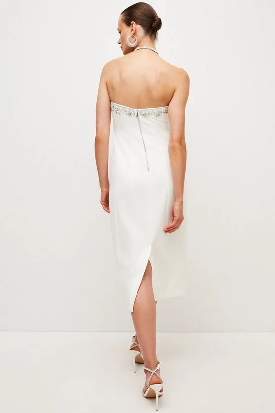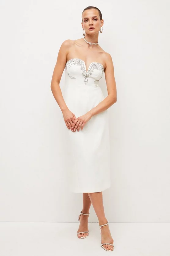 Designed to seductively sculpt the curves, this premium cady midi dress is sure to boost your confidence. Sparkling diamante crystals frame the plunging sweetheart corset, revealing polished shoulders to sultry effect. It zips at the back for easy wear, draping down to a demure mid-calf length accented with a subtle hem split.
