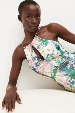 A style that sparkles beautifully beneath the moonlight, this Art Deco-inspired maxi dress glimmers with beaded tassels and opulent embellishments. Our designers have added a high neckline and sleek, semi-sheer sleeves to modernise the glamorous details, and finished the look with a leg-baring split hemline and gauzy, semi-sheer overlay.