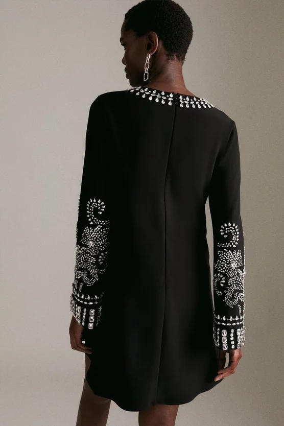 Turn heads in this elegantly embellished mini dress. Combining a swinging sixties-style silhouette with crystal detailing and gently flared sleeves, itβs the perfect plus-one to every party in your calendar.