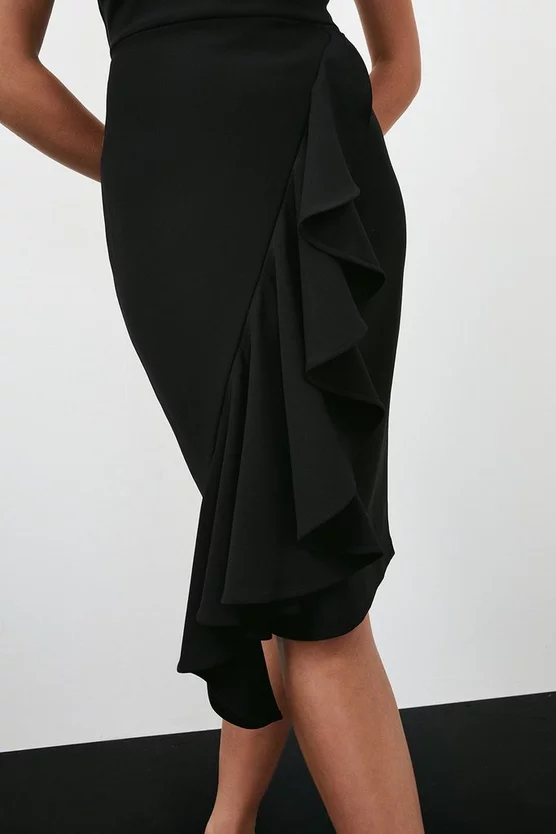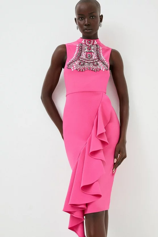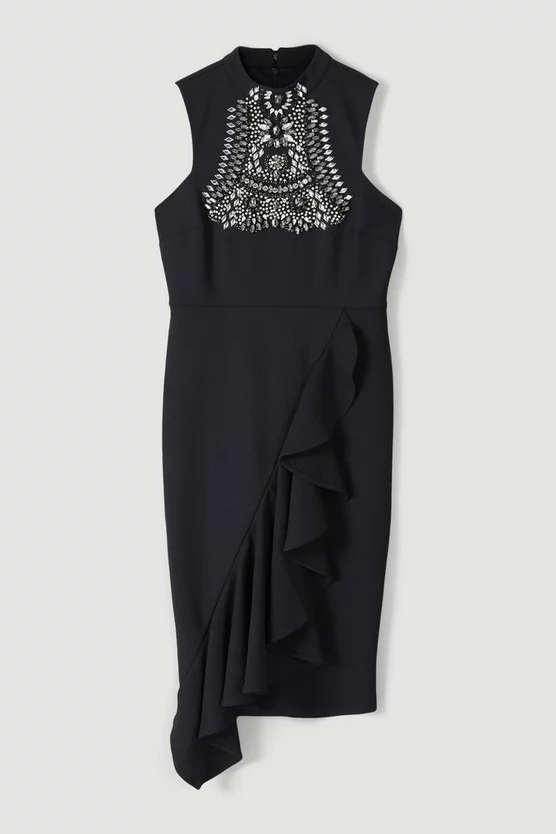 Intricately detailed with an essence of opulence, this midi dress combines timeless tailoring with runway-inspired elevation. Crafted from Figure Form crepe for a contouring effect, the high neckline of this piece is studded with an intricate crystal formation that catches the eye. It lands at a ruffled skirt for extra dimension – a form that perfectly pairs with barely-there heels for a balanced effect.