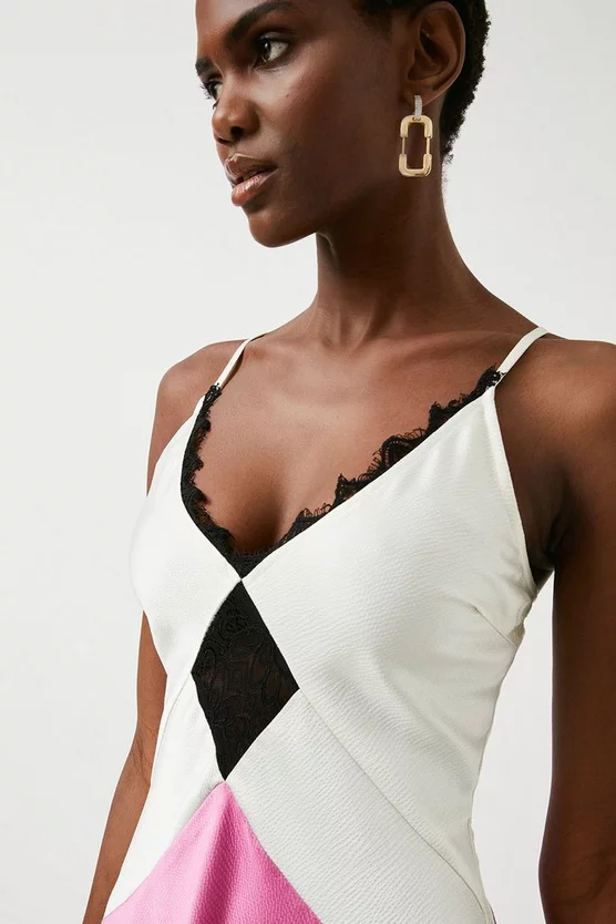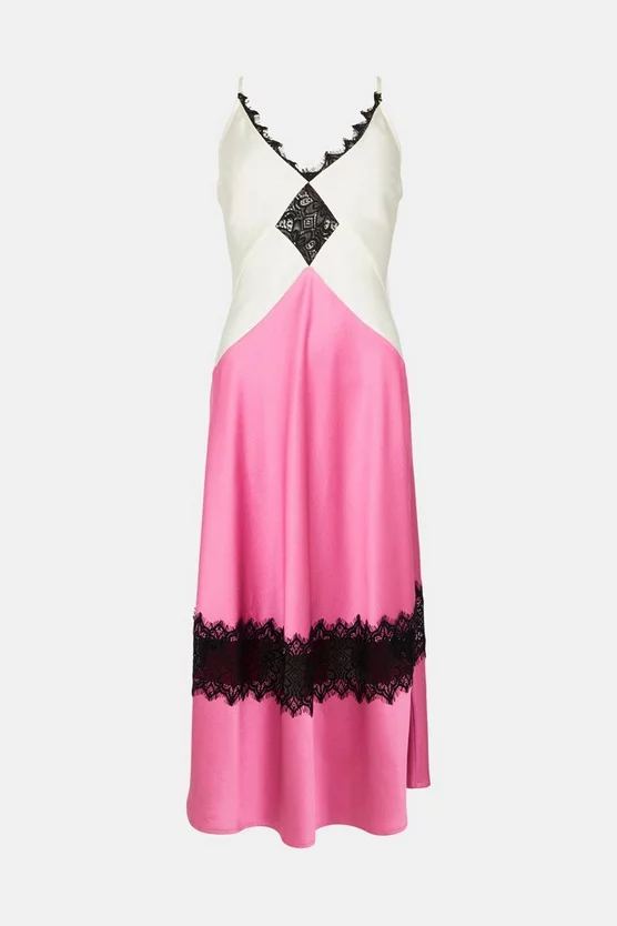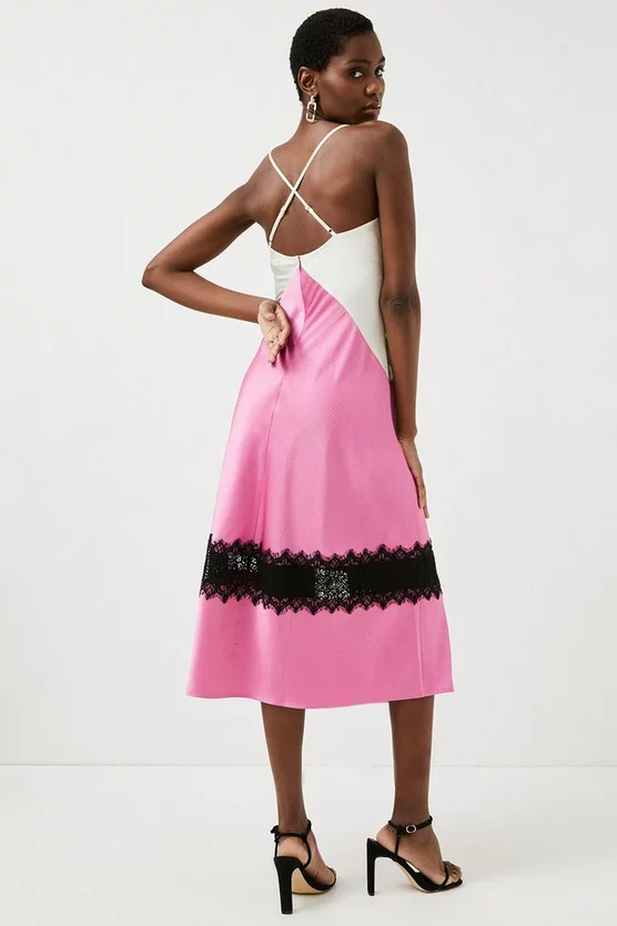 Rippling romantically over curves, lustrous hammered satin lends this draped midi dress an opulent feel. It comes spliced with luxe lace trims and shows off slender straps and a crossover back detail that bares polished shoulders beautifully.