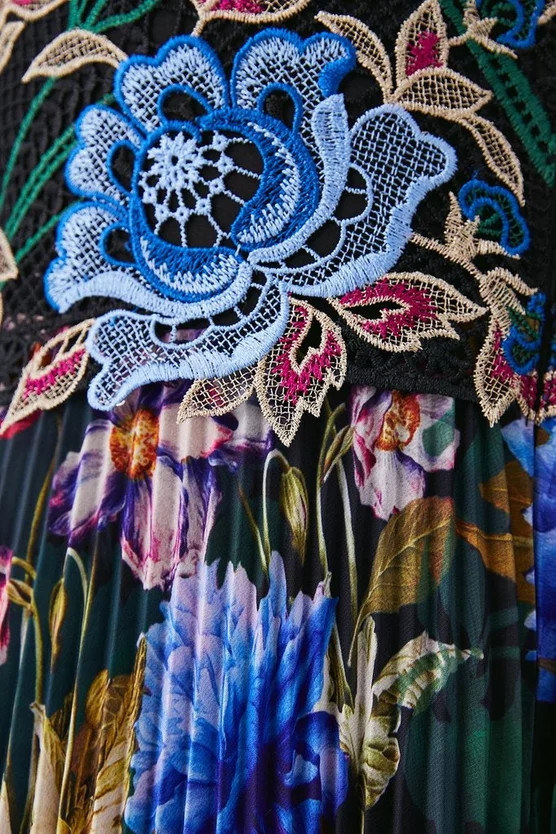 Crafted with opulent guipure lace, this pleated midi dress is the epitome of elegance. The bodice is adorned with applique floral details, adding an undeniably feminine touch. Soft pleats fall down to the ankles, showcasing a mesmerising floral print.