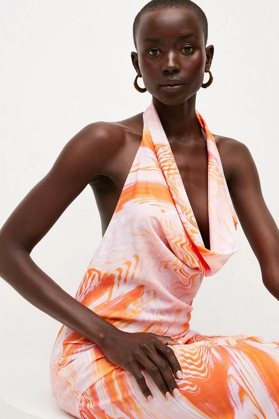 A zesty, colourful print is the defining feature of this flowing midi dress. Combining a draped cowl neckline with an open back and sultry hem split, this slinky summer dress looks the part at summer parties β make it dance floor-ready with the addition of coordinating colour-pop accessories to offset the opulent optical print