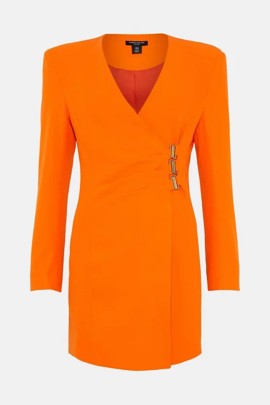 Directed by classic tailoring, this mini dress appears with bold aplomb. Defined by oversized shoulders, this sharp piece has contemporary buckled detailing to the waist-defining bodice.