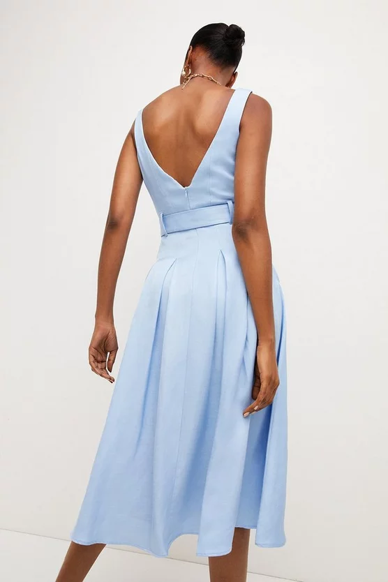 Updating the classic prom-style silhouette with its pressed linen construction, this premium midi makes a considered choice for summer soirees. It features a timeless square neckline, retro buckled belt and flared midi skirt for a demure, polished finish.