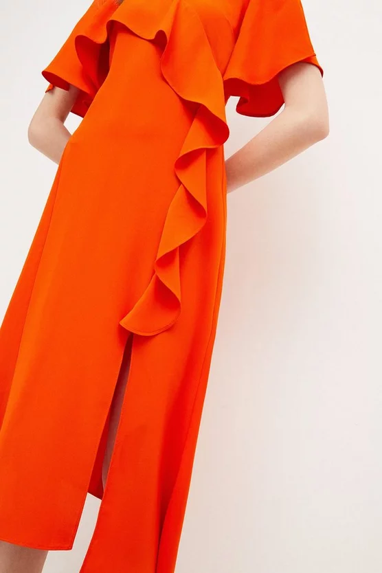 Romantic ruffles are sharpened with effortless tailoring for this dimensional midi dress. Draping the body with soft jersey for a statuesque finish, itβs defined by a frilled neckline and floaty short sleeves with split cuffs. Fitting the bodice before falling to a split skirt, pair with gold stilettos and oversized hoops for statement-making magic at summertime soirΓ©es.