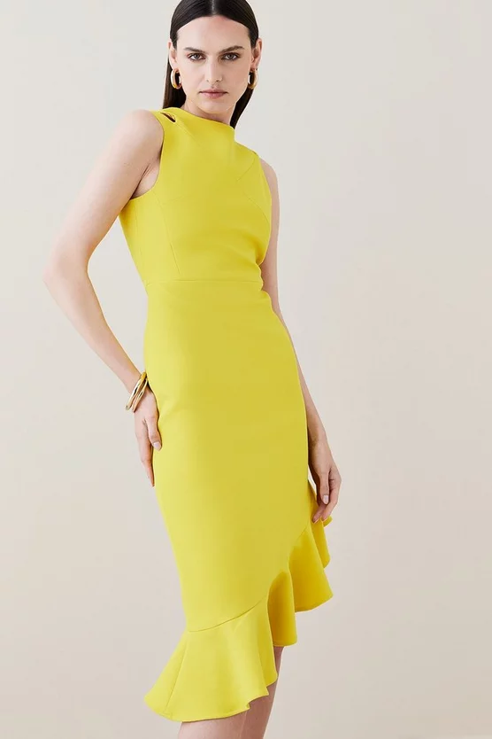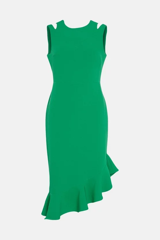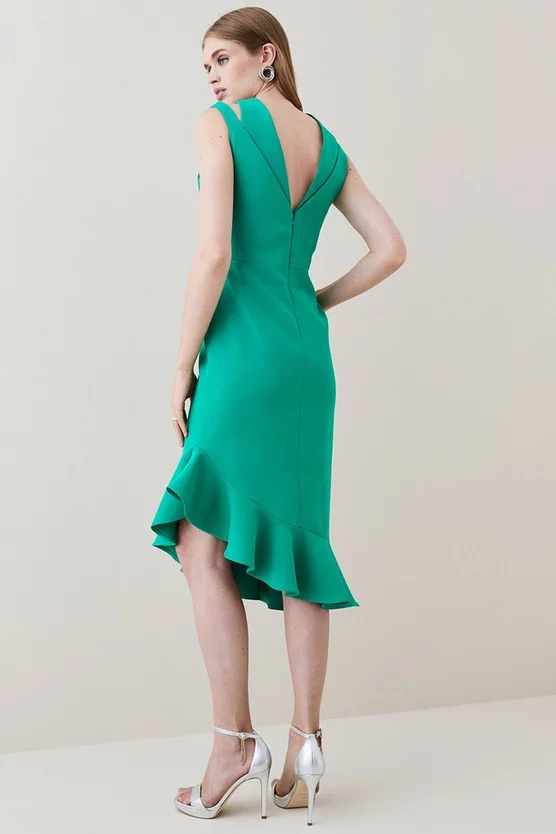 Feminine ruffles enhance the streamlined silhouette of this beautifully crafted midi dress. Detailed with spliced shoulders and an asymmetric hem, it hugs the figure in all the most flattering places, spun from our signature structured crepe fabric for a luxe, premium finish.